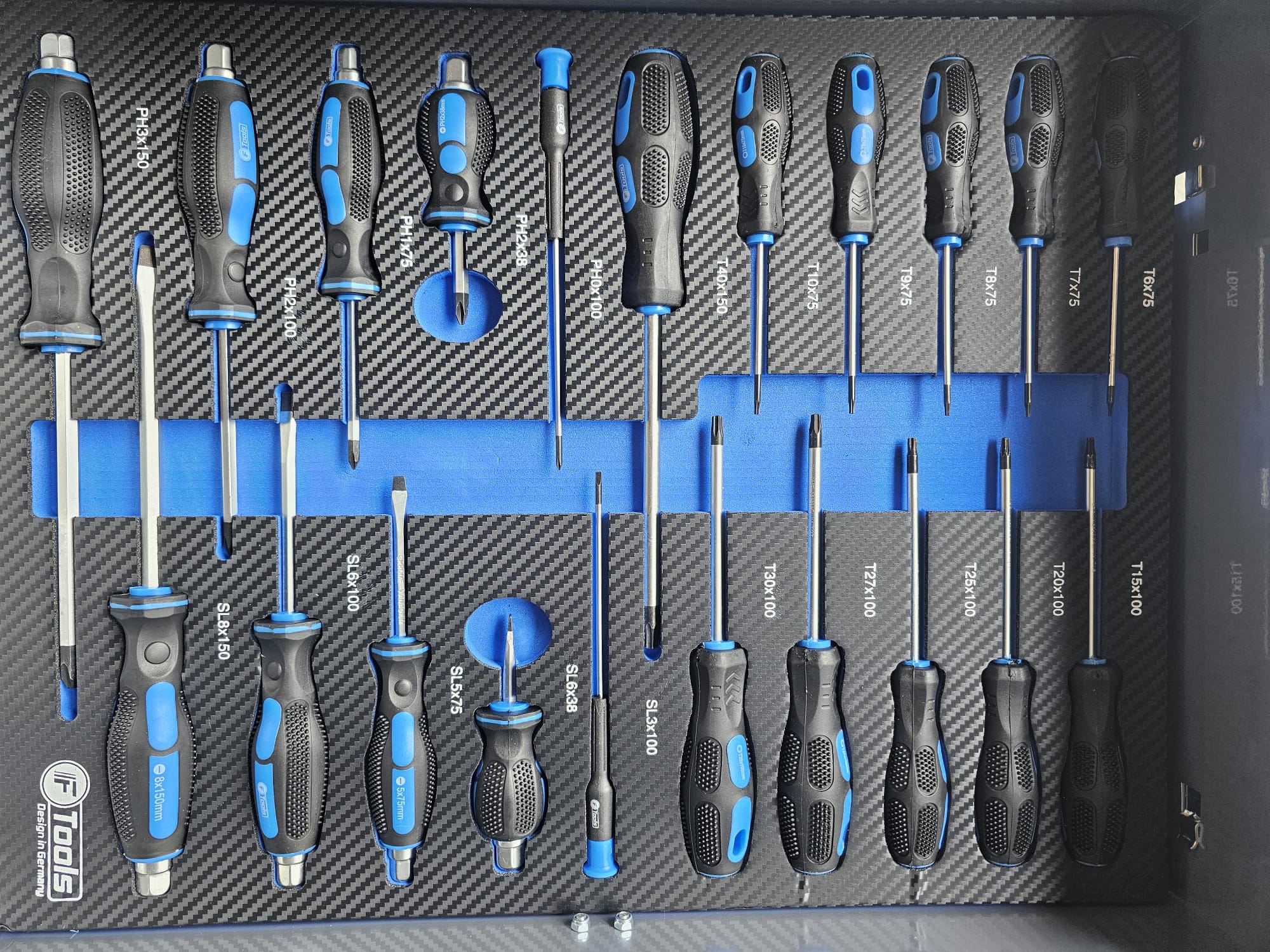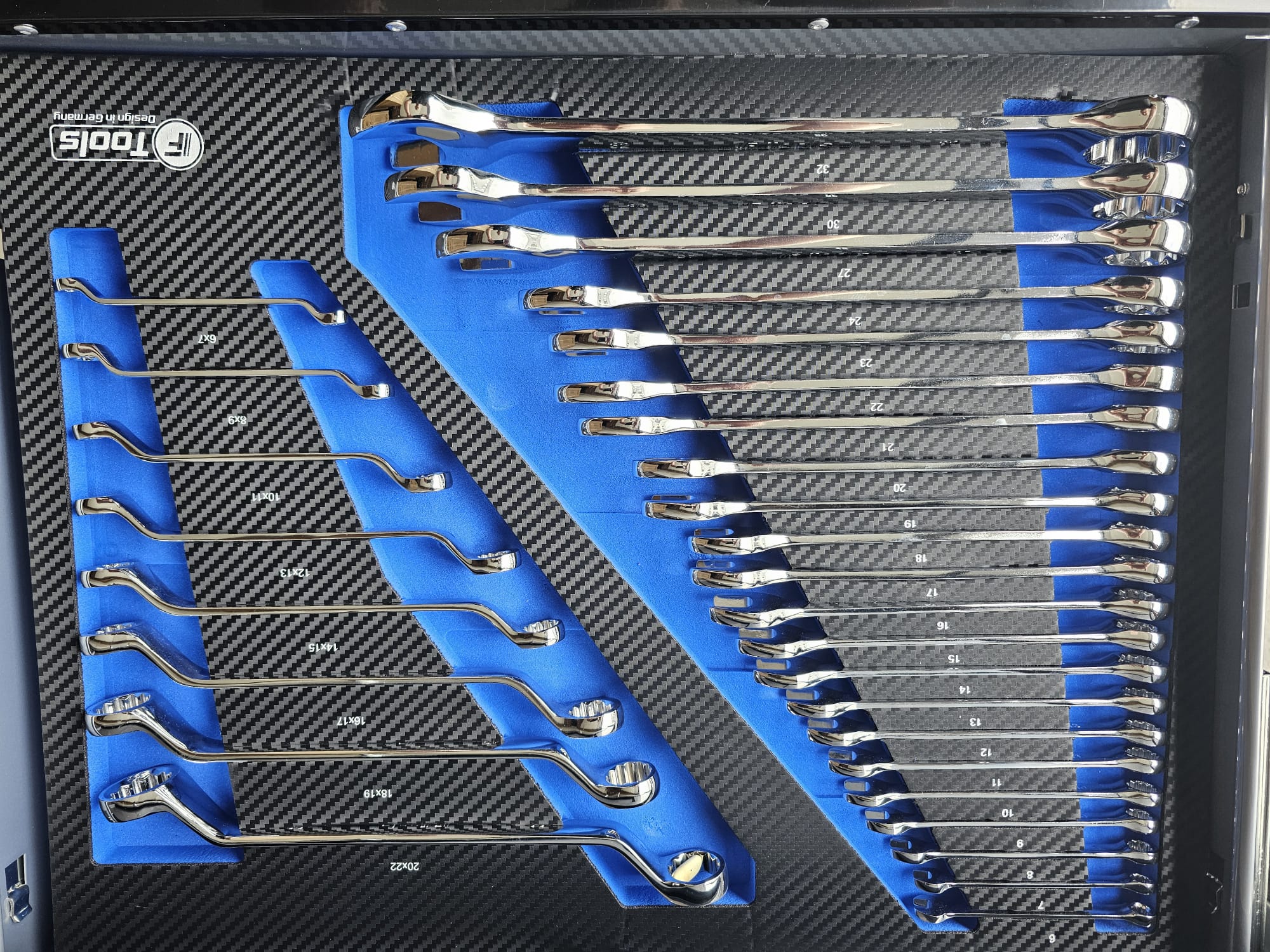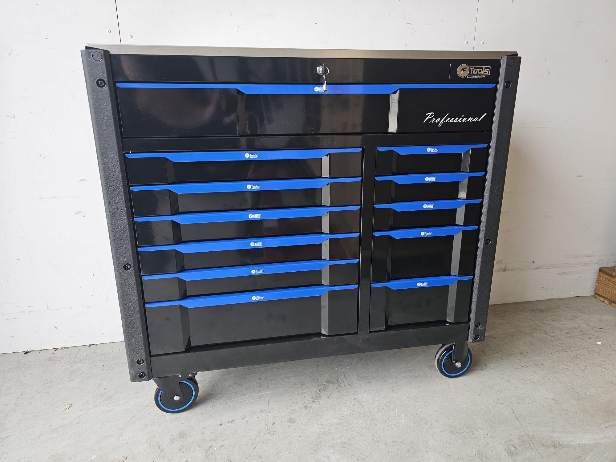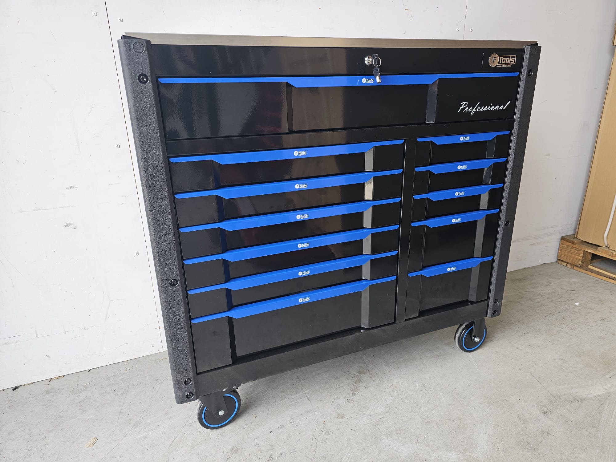 The FTools Tool trolley with 12 drawers is an indispensable tool for every professional workshop. With full extension drawers and a wide selection of professional tools, this cart offers both convenience and functionality. Whether you choose the all-metal version or the black version with blue accents, you are assured of a durable and stylish solution for your tool storage.